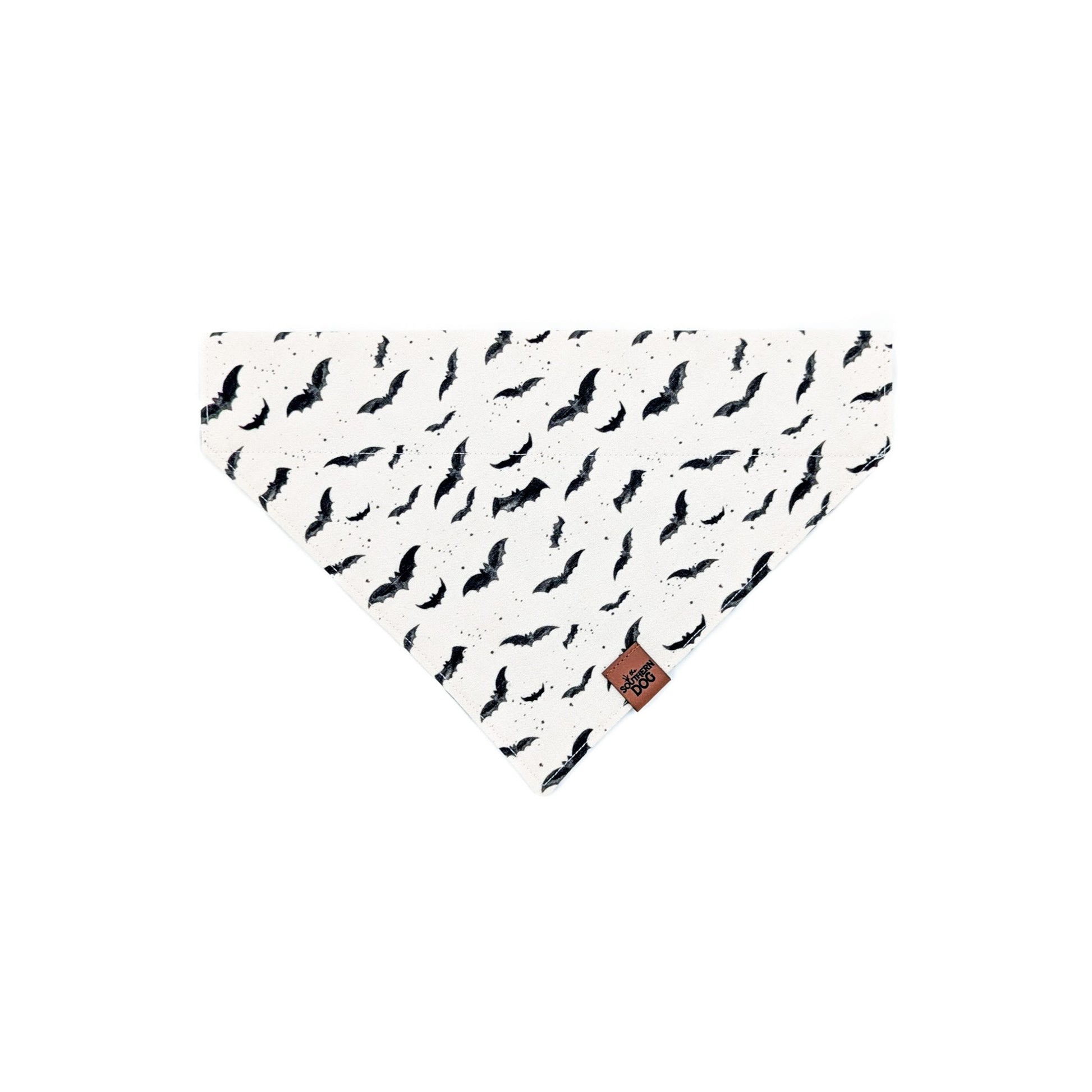Our Spooky Bat Dog Bandana features playful pops of black bats on a crisp white background, adding a touch of Halloween charm to your pup’s style.