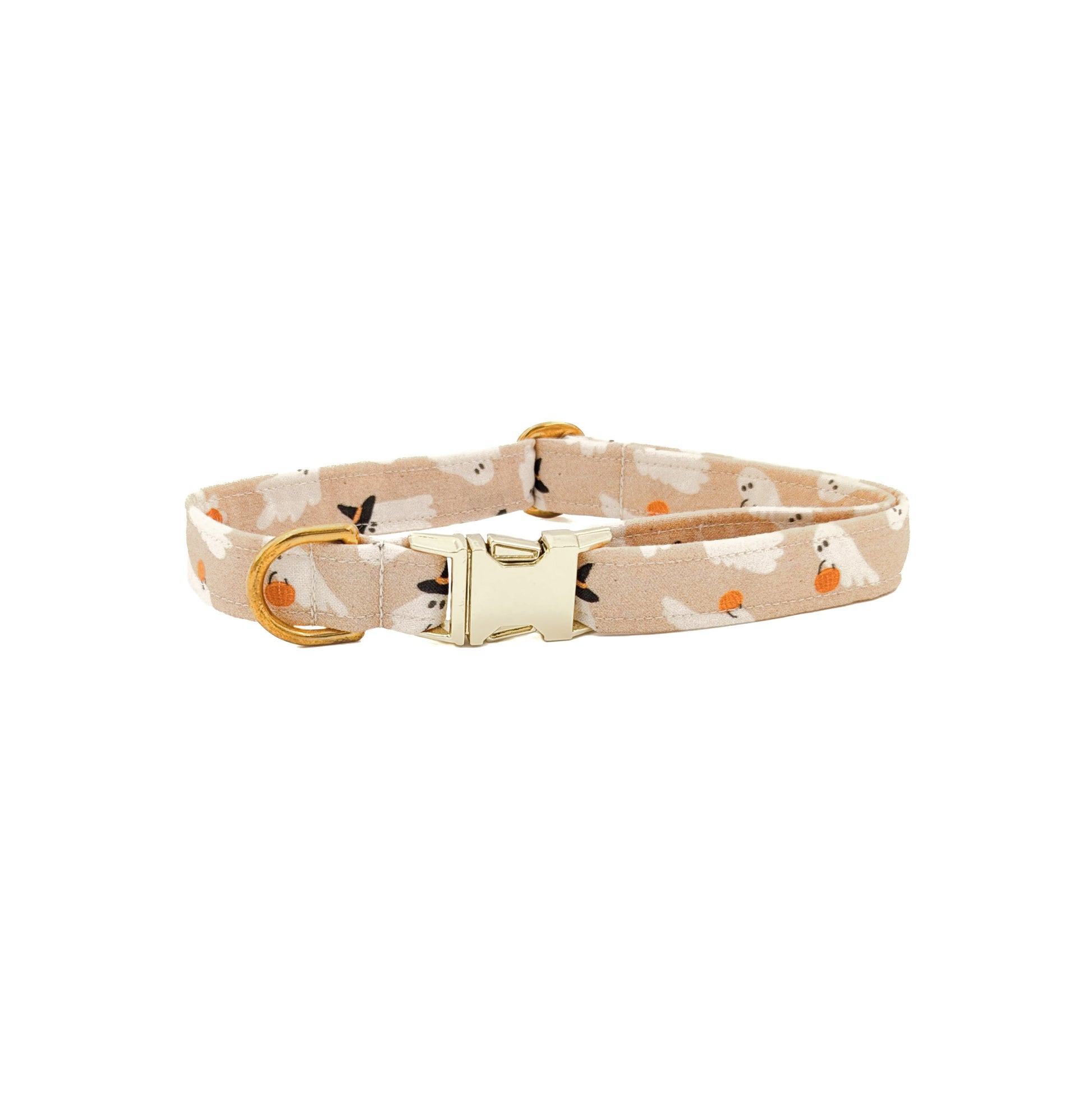 Our Spooky Ghost Dog Collar is a cute ghost pattern on a tan background.